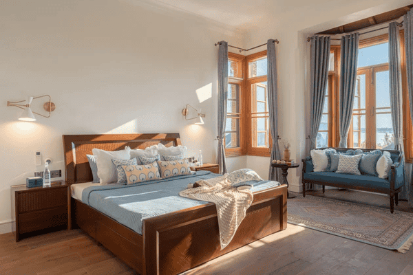 Inside, Noor features Kashmiri Khatamband ceilings, wooden flooring, windows with breathtaking views, and a blend of antique and contemporary furnishings that create an idyllic welcome. As you ascend to the first level, you’ll be immediately drawn to the living area with views that are undoubtedly the home’s highlight. Start your morning here with a cup of Kahwa, taking in the soothing views of Dal Lake and the surrounding mountains, and end the night with a glass of wine as the sunset shimmers on the water’s calm surface.
